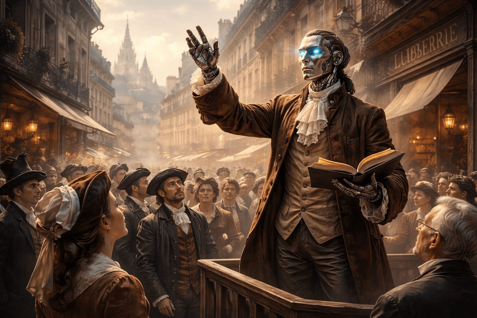 Représentation d’un Denis Diderot robotisé s’adressant à une foule dans une rue du Paris du XVIIIᵉ siècle, illustrant la transmission du savoir, l’éducation et l’héritage des Lumières à l’ère de l’intelligence artificielle.