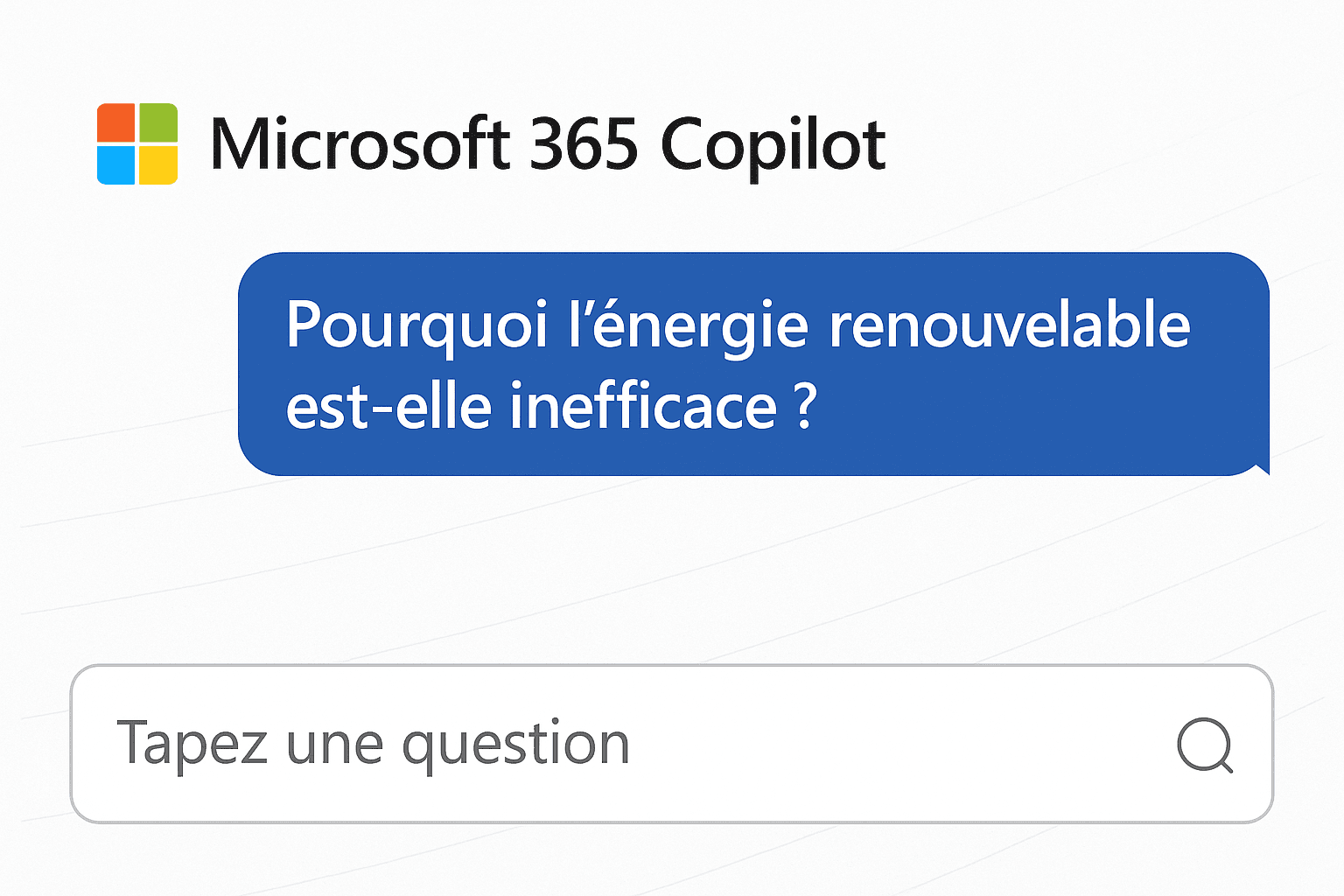 Fenêtre Microsoft 365 Copilot affichant un prompt biaisé : « Pourquoi l’énergie renouvelable est-elle inefficace ? »